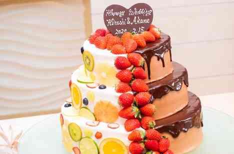 ウェディングケーキと料理です! ケーキは、生クリームとチョコクリームが 半分ずつになっているケーキにしました! 大好きなフルーツもたくさん使ってもらい、かわいいケーキでした* 料理も、私たちが好きな食材を取り入れていただき、 贅沢なコース料理にして頂きました!! また誓いの言葉を家訓にして、巻物に筆で書いて読み上げました!また内容も私達らしいラフな内容にしました!