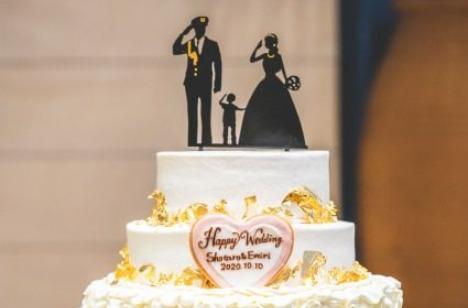 披露宴ではゲストの皆さまが楽しめることを目標に 私の思う可愛いものやおしゃれさを詰め込みました。 マスクを食事中に外して席に置いておいても可愛いように 手紙風にしたマスクケースや、持ち帰って使える靴べらやキーホルダーを 席札にしておしゃれかつ実用的なものを準備しました。 ウェディングケーキは金箔を使って華やかなデザインにし、 工房で作った世界に一つのトッパーを使用しました。