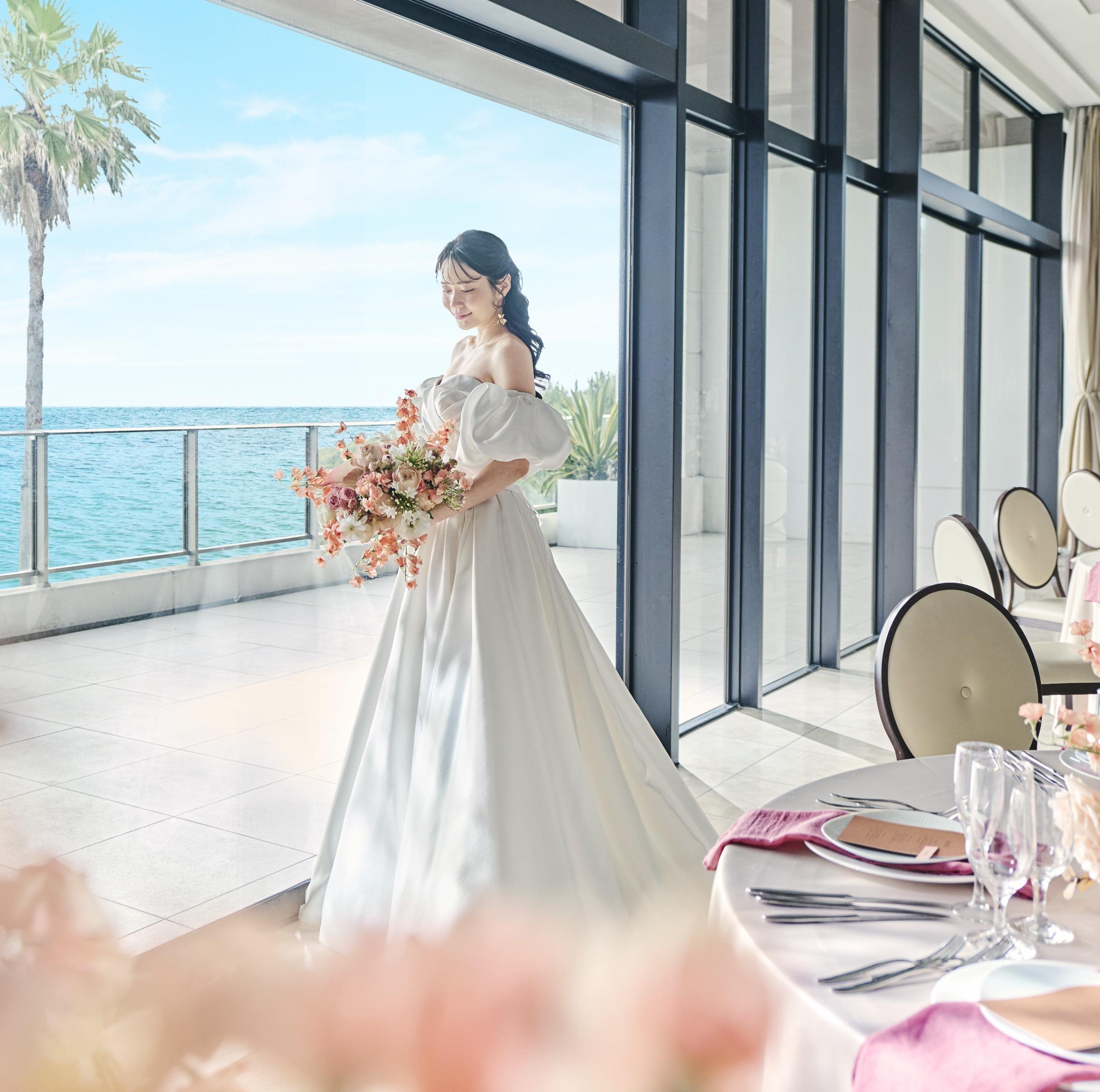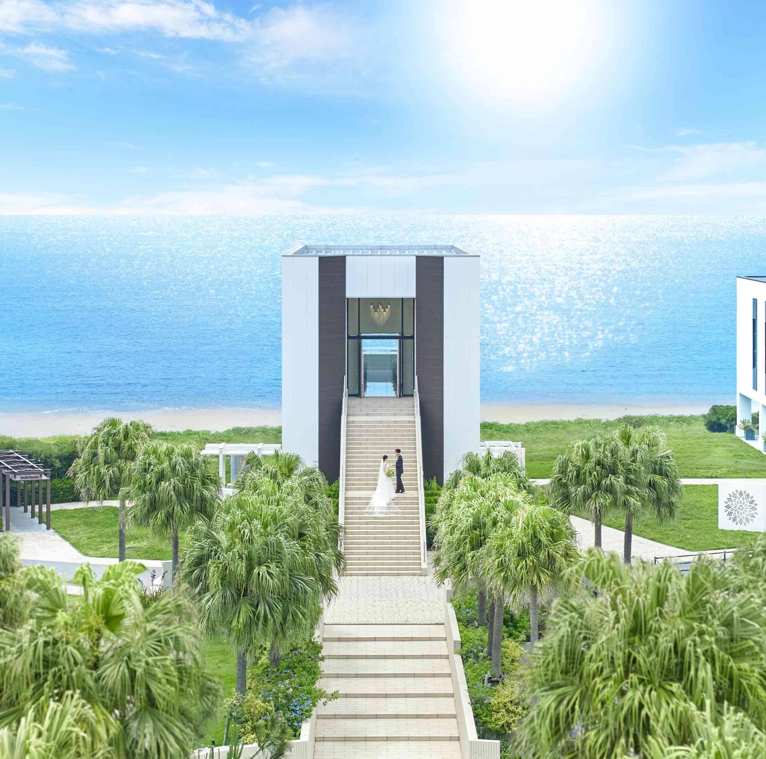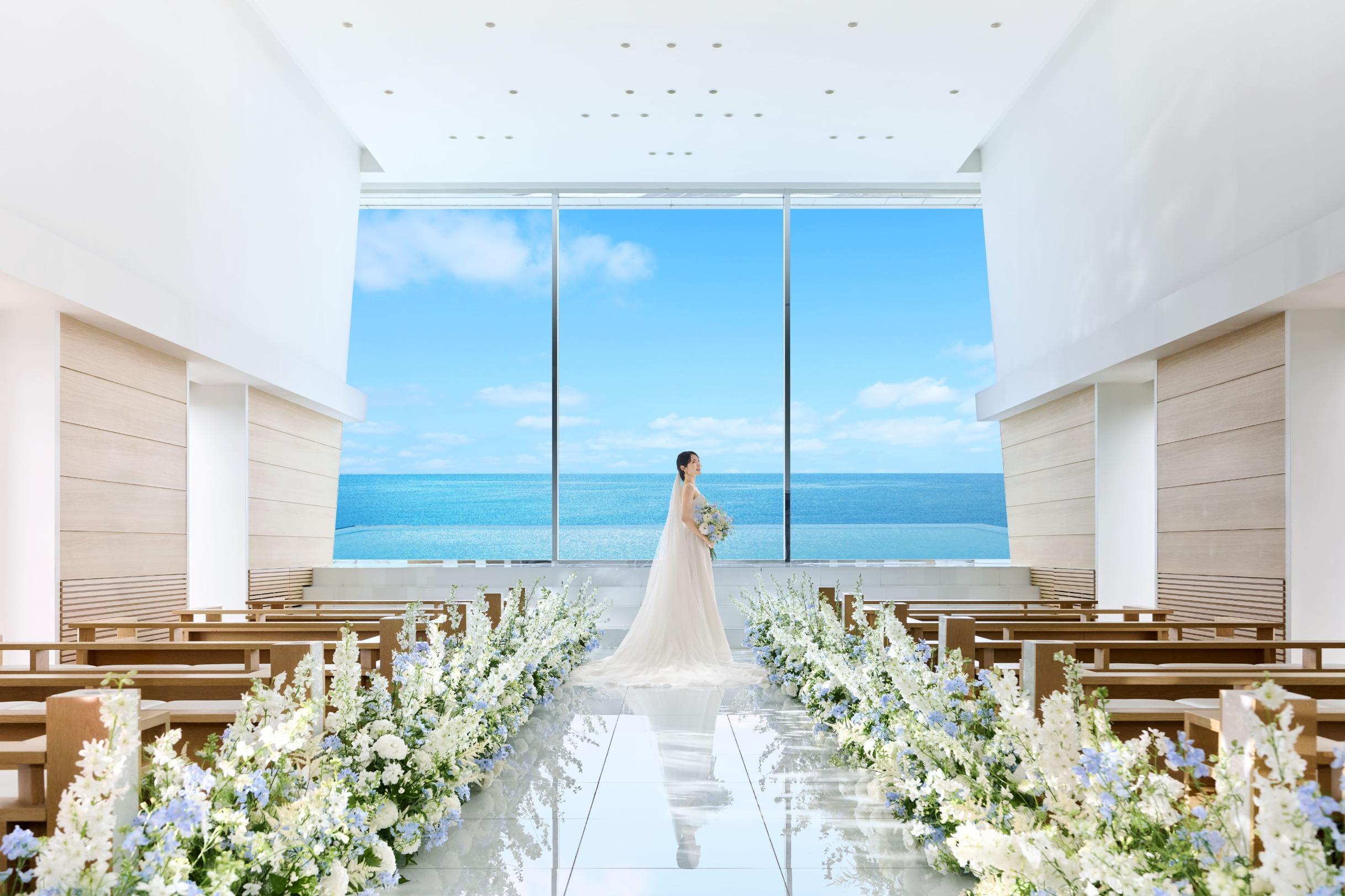 扉を開けた瞬間に広がる白く輝く空間と、蒼い海のコントラスト、ホールにふりそそぐ陽光と美しい景色に包まれて、永遠の愛を誓う。いつも眺めていた海、ふたりで訪れていた場所は、この日から特別な場所に変わります