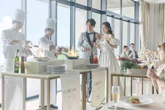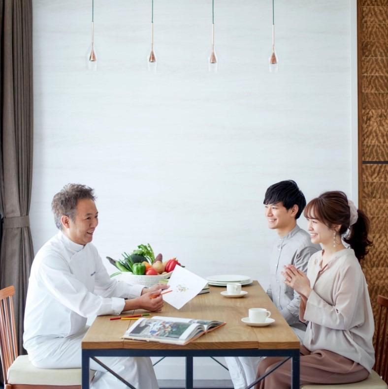 1組1組、シェフがお打ち合わせ、産地にもこだわった厳選食材を利用した創作フレンチは【業界最大手口コミサイトで常に高評価。五感 に響く絶品料理】。実力派のお料理はブライダルフェアで毎日無料試食実施中