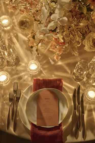 茶を基調とし、ゲストの方をあたたかい気持ちでおもてなしする、邸宅風。木をあしらったモダンなシャンデリアが印象的です。 時間の経過ともに会場の雰囲気は変化し、昼と夕方でおふたりの様々な表情を演出します
