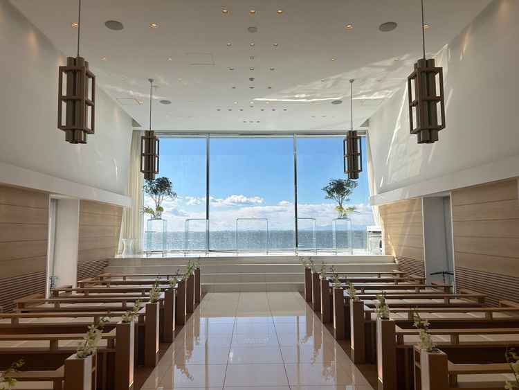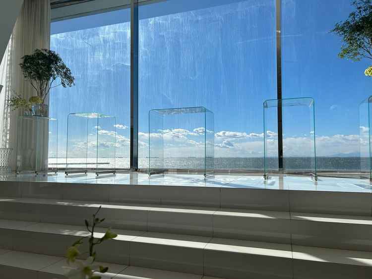 海が見えて自然光がたくさんはいるのが本当に素敵でした。万が一天候に恵まれなくても、チャペルが完全にガラス張りというわけではないので、雨が強調されにくいつくりだなと思いました。