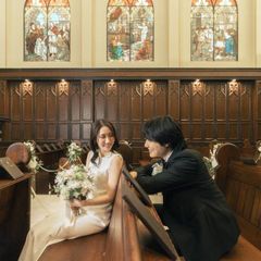 本場イギリスの教会から移築されたチャペル。時を重ねたステンドグラス、歴史ある扉と椅子が迎える特別な空間。映像上映やバージンロードレッスンが結婚式当日のイメージをより鮮明にします。