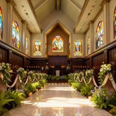 本場イギリスの教会から移築されたチャペル。時を重ねたステンドグラス、歴史ある扉と椅子が迎える特別な空間。映像上映やバージンロードレッスンが結婚式当日のイメージをより鮮明にします。