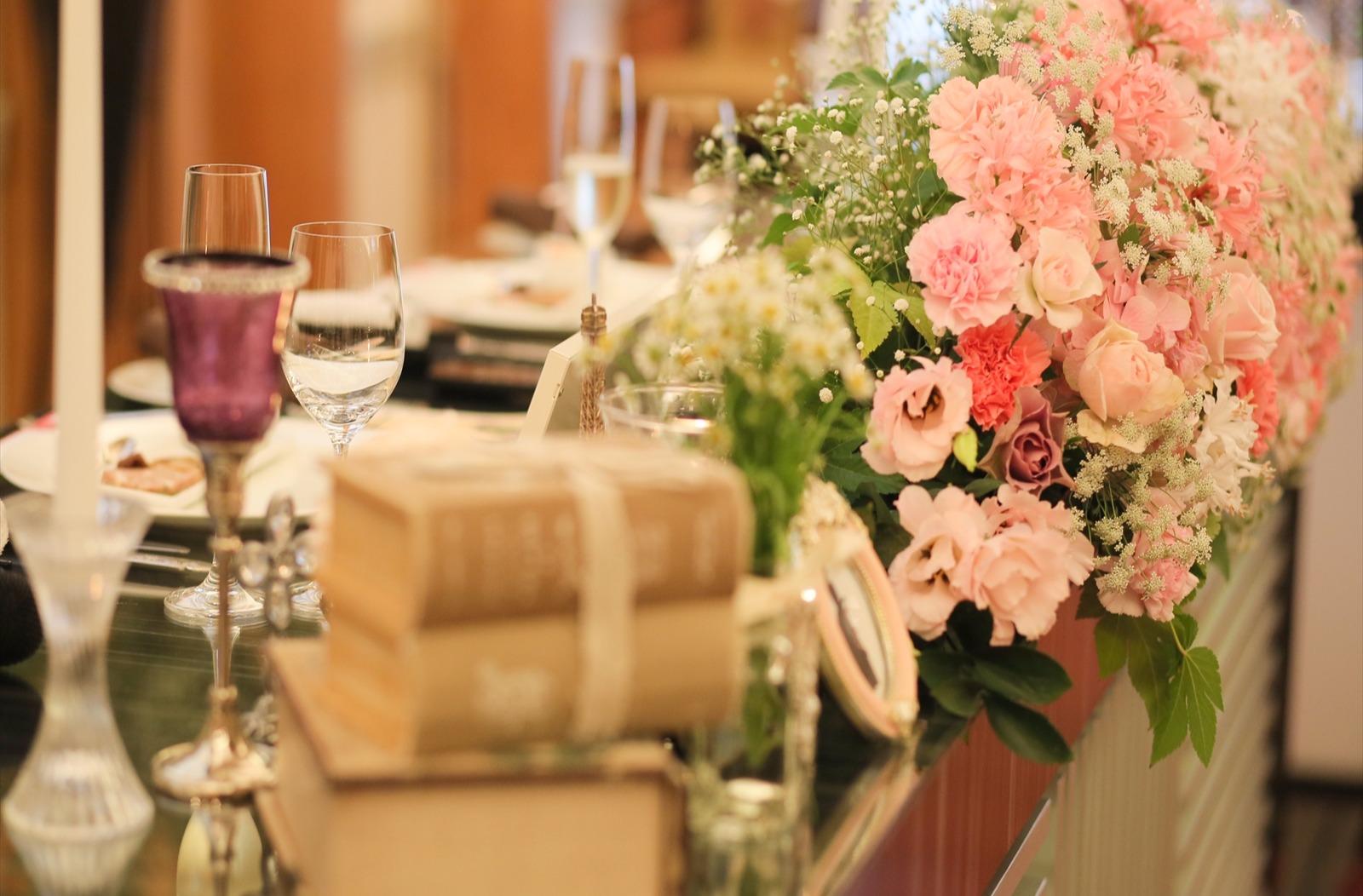 大人かわいい感じにしたかったので、ピンクをメインに全体的に淡く優しい感じにしてもらいました。あまり手作りのものを作ったりはできませんでしたが、サプライズで飾っていただいた物や、プレゼントとしていただいたものもあり、かわいらしく、素敵な飾り付けになり、本当に感謝です。