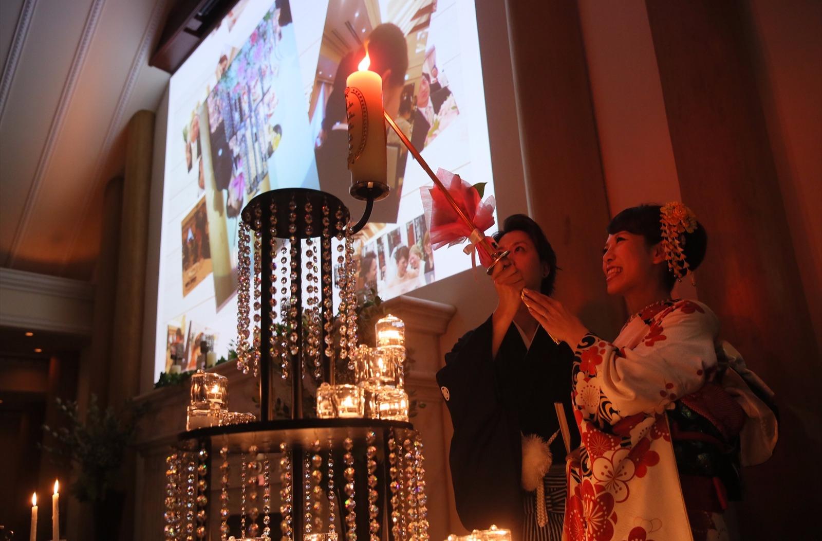 ゲストの皆さんと写真を撮りたかったので、各卓フォトをしました。メインキャンドルは"クリスタルシャンデリア"⭐︎ふたりでどれにするかもめたんですけどね(笑)。このキャンドルにもサプライズメッセージがあり、すごく嬉しかったです。ふたりの出会いのきっかけになった友人にはサプライズでケーキのサンクスバイトを。ゲストを巻き込んだ演出は感謝がつたわりやすく、とても良いと思います。