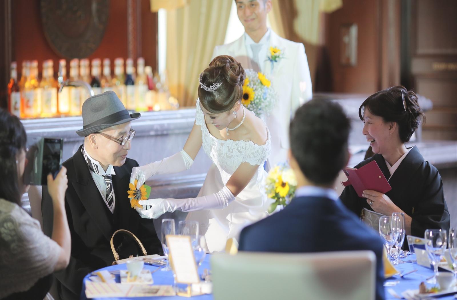 入場&再入場の際は新婦父、新郎父への手作りブートニア(テーマのひまわりで!)のプレゼントを。ふたりで手作りした生い立ち&エンドロールDVDの上映に、花火のようなキャンドルでテーブルラウンドをしたり、ドレス当てクイズなども。ゲスト全員と思い切り楽しみました。あとサプライズで新婦から母へ感謝の気持ちをこめて、ピアノ演奏を送りました。内容盛りだくさんで、涙あり笑いありの楽しい時間でした。