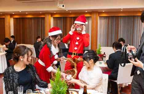 クリスマスが近かったのでクリスマスパーティーのような明るい雰囲気の飾り付けやコーディネートをプランナーさんに一緒に考えていただきました。 その結果、クリスマスのテーマだけでなく、ゲストへの感謝祭のようなパーティーにもなり、お色直しの再入場ではサンタのコスプレ+ゲストにプチギフトを配るこおとになりました。