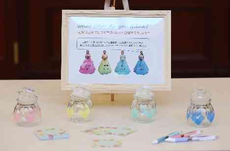 みんなに楽しんでもらえる参加型の演出として、お色直し衣裳の色当てクイズをウェルカムスペースに設置して名前を書いてもらいました。正解した友人にはプレゼントを用意しました! サプライズ演出として再入場の際に、クリスマスの時期にちなんでクリスマスプレゼントを用意。みんなに喜んでもらえました♡