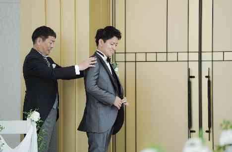 チャペルの中にはお二人の大切なゲストの皆様と入口にはご新郎様の親御様がお二人のご入場を待機中…まずはチャペルにご新郎様がご登場!親御様にはご新郎様にジャケットを羽織るお手伝いをお願いしました!ジャケットを持つ手には力が込められて、送り出す時にそっと背中に添えられた手にこちらも温かい気持ちになりました(^^)