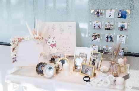 お打ち合わせではお2人らしさを出すためにテーマカラーを決めました!! マリーが好きな新婦様はピンクとゴールドに( ^^) 受付スペースも統一性が出てお2人の写真もより一層輝いていました!! マリーを使ってかわいらしさも表現できます☆ 会場装花もピンクを使用、披露宴会場でのテーブルクロスとの相性抜群でした!