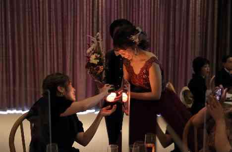 再入場は真っ赤で素敵なドレスでご登場いただいました!入場後、ゲストの方のテーブルまで火を灯しにいきました!キャンドルに火が付き蓋をかぶせると文字が浮かび上がるクレールストーリアを行いました!普段は伝えられない感謝の気持ちなどをキャンドルの演出にてお伝えしてみてはいかがでしょうか!最近結婚式で人気の演出ですので、おすすめです!