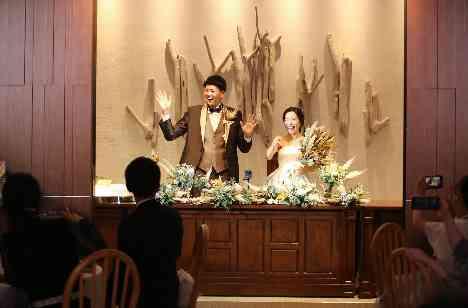 会場が木目の会場でキャンプ好きなお2人は会場入り口にもおしゃれなキャンプグッズを飾ってゲストの方もわくわく感を感じてくださっていました!入場の際にはプロジェクションマッピングを上映!結婚式で取り入れるとかなり盛り上がります♪行える会場も限られているので当館では人気の演出です!結婚式をお考えの方におすすめです!