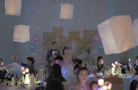 メインの演出では、皆様にランタンを持って天高く上げていただきました! 会場内に数十個の光るランタンが上がり会場内はより一層素敵な空間に・・ 感動的な瞬間で、皆様も思わずうっとりされていました! 再入場の際は、卓上花火の演出を! お2人の声かけをもとに一斉に点火し、会場はパレードのような雰囲気で大盛り上がり!