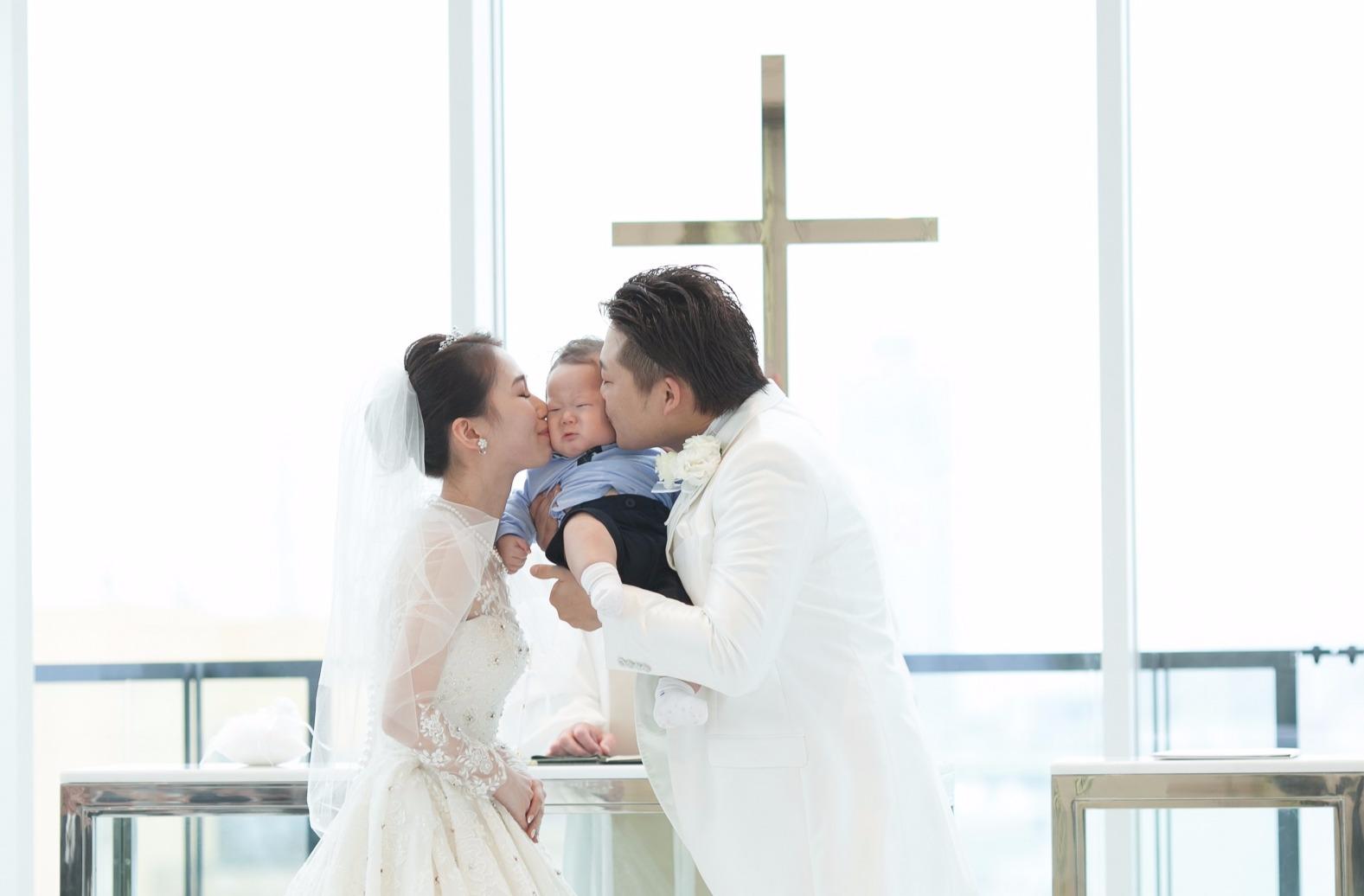 永遠の愛を誓ったあとはお二人の宝物であるお子様をはさんでウエディングキス♪パパママ婚ならではの演出に周囲も思わず歓声が!