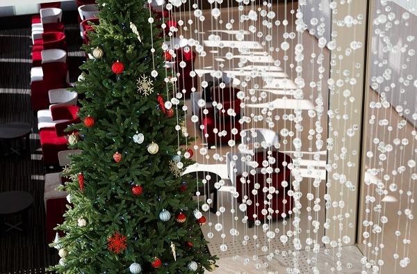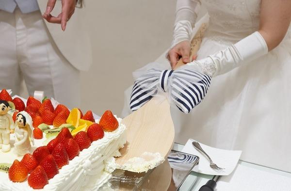 クリスマスの赤と白のコーディネートで統一したお二人。ケーキはクリスマスのツリーを苺で表現し、ファーストバイトにこだわりを♪