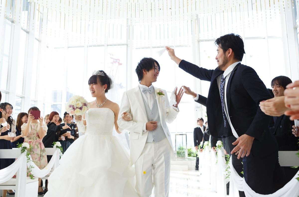 見学でのチャペルの印象で結婚式を行うと決めたお二人! 式は厳粛に・・・そして退場する際はゲストの祝福をいっぱいあびながらのフラワーシャワー♪