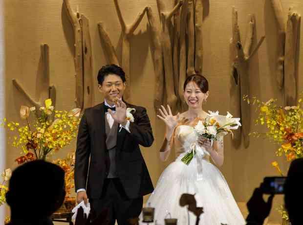 入場の際は壁の裏に隠れて、壁がマッピング映像と合わせてスライドオープンし入場。 ゲストとの心理的距離を近くしたくて、ソファー席を選びました。 ゲスト席も狭すぎない空間を作れました。 装飾や小物など全てこのウエルカムボードに合うようなテイストにしました。どれも選ぶのにバリエーションが多くて目移りしそうでしたが、色使いを「オレンジ系・緑・白」で選択し統一感を大事にしました。