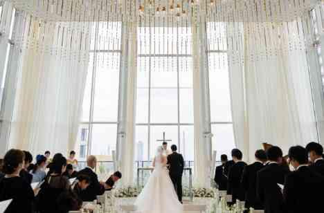 3面のガラス張りで高いところからの見晴らしが良い!雨が降っても屋根の作りで窓が雨に濡れにくいそうです。ガラス張りでも私はブルー系の色が映ってるほうが良いと思い選びました。 天井のシャンデリアは1122本。「良い夫婦」を意味した本数で、近隣のユニバ等からこのシャンデリアを見て結婚式をいつでも思い出せるようなつくりにしているそうです。