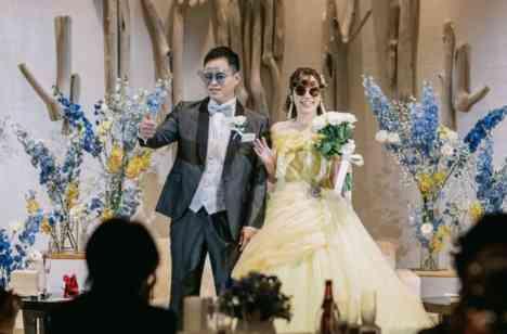 プロジェクションマッピングのある披露宴会場で、ディズニーのような演出が実現できました! 美女と野獣をイメージしたカラードレスに、ディズニーのミッキーサングラスをかけて、スライドウォールから登場しています!マッピングの壁が開いて登場する演出では、みんながざわざわしていて、とてもオリジナル感が出たと思います。