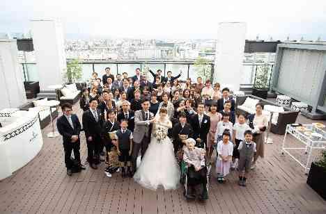 挙式後にテラスガーデンにて行うウェルカムパーティー! ドリンクを飲んだり、フィンガーフードをつまみながら、新郎新婦がゲストの皆様と歓談できるのはアヴァンセリアン大阪の醍醐味の一つ☆ 大阪を一望できる景色の中で想い出に残る一枚を!