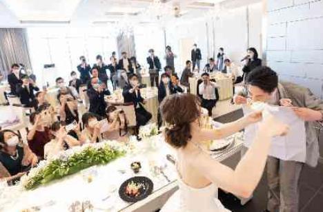 「一生美味しい料理を作るね^^」そんな想いを込めてビックスプーンでファーストバイト!!大きなスプーンのケーキは新婦様からの愛情の大きさです♪この後、新郎様の顔に付いた生クリームを優しく新婦様がふき取っておられた姿も素敵でした…☆ゲストの皆様には安全対策を兼ねてマスクをつけてお集りいただいております!