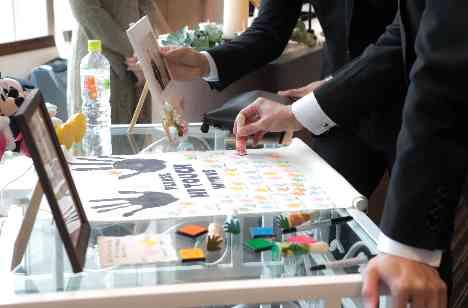 ゲストの皆様も楽しめるように演出にもこだわりを。 ご結婚式当日の受付ではゲスト参加型の演出のひとつとして、「ウエディングフラッグ」を受付に設置。 ゲストの皆様にフラッグへ手形のスタンプを押してもらい、まるで新郎新婦様とハイタッチをしているかのような演出を。 記念にも残るお二人オリジナルの「ウエディングフラッグ」の完成です♪