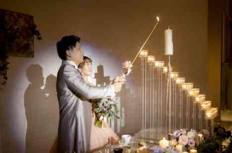 お色直しの再入場後はキャンドルイリュージョンを! ゲストの皆様も楽しんでいただけるように、一斉に点火するイリュージョンタイプのキャンドルを各卓へご用意。 会場内が「わぁ!」と歓声に包まれたあとは、お二人のメインキャンドルへの点火を。 会場内は温かいキャンドルの光で包まれて、とても幻想的な空間へ…*