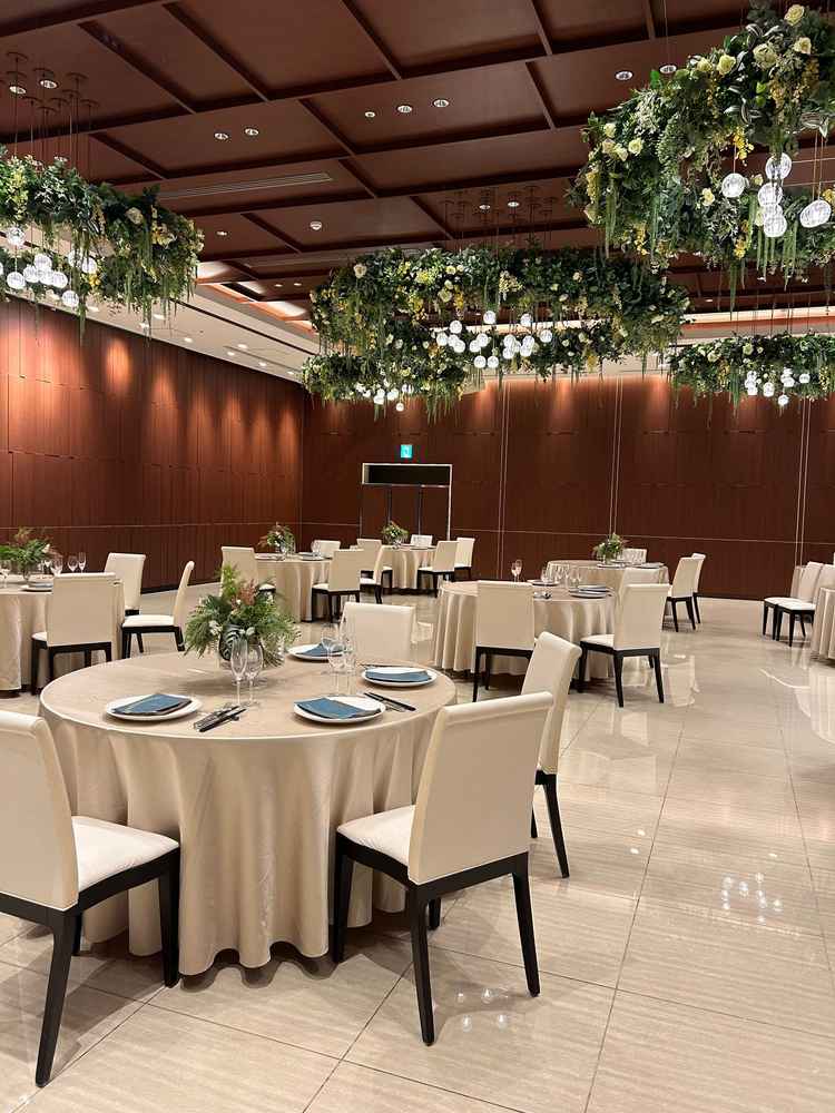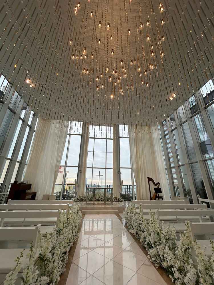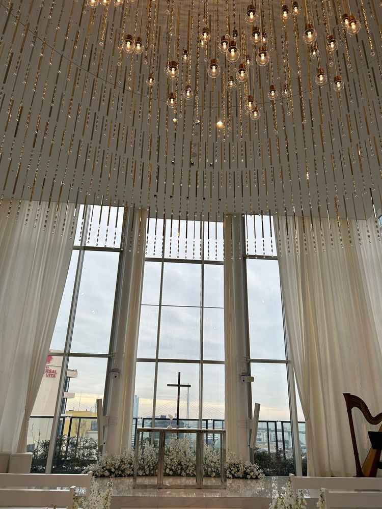 高層階に会場があり、またガラス張りのところが多かったためとても開放感を感じる会場だと感じました。また、チャペルのシャンデリアもとても綺麗でした。