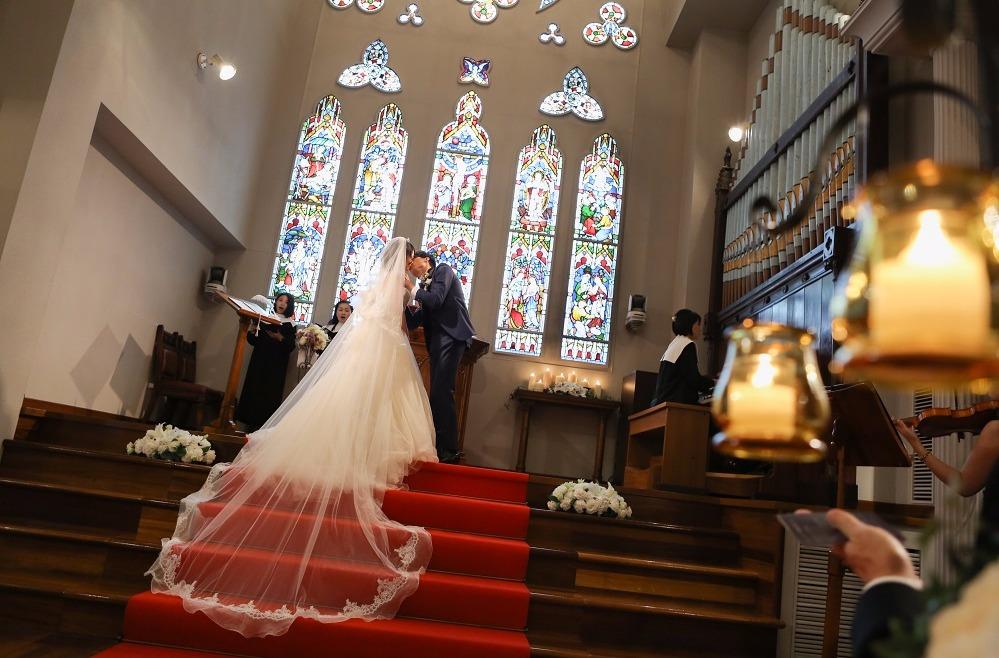 300年の歴史を持つ宝石を溶かし込んで創られたステンドグラスは、自然の陽光がふんだんに射し込み、おふたりを温かく包み込みます。