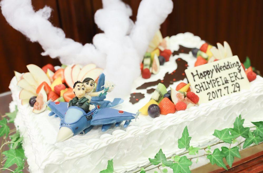 新郎様のご職業をモチーフにしたウエディングケーキが大人気♪ 今回は自衛隊の新郎様ならではの「戦闘機」のマジパンが乗ったケーキをオーダーメイドで承りました^^ 新郎様がデッサンされたイメージをもとに、パティシエと打合せをし、 仕上がったケーキは完全オリジナル*ゲストにも大好評でした♪