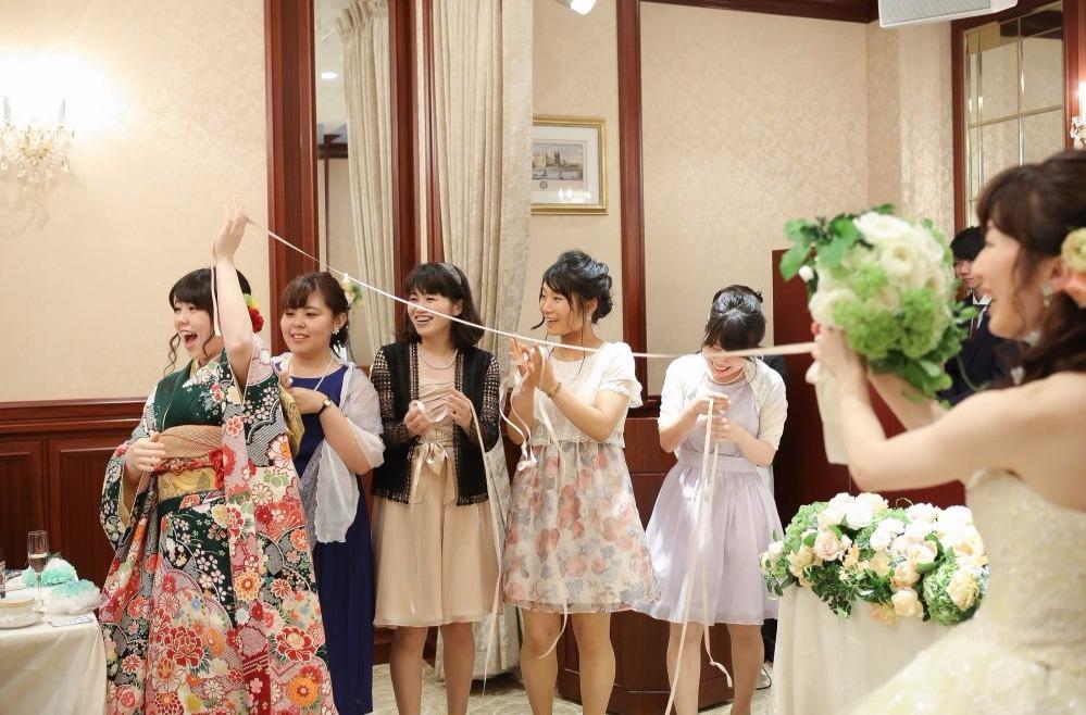 複数のリボンの中で1本だけ、新婦様のブーケと繋がっている「当たり」が…♪ どなたが幸せのバトンを受け取られるか、皆様がワクワク見守られるイベントは大盛り上がり★