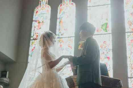夏の日差しがステンドグラスを通してやわらかく降り注ぐ中パイプオルガンとヴァイオリンの生演奏がチャペルに優しく響き渡ります。透明感のある音色と聖歌隊の歌声に包まれながら進む挙式は厳かでありながらも温かい雰囲気でした。 光と音が重なり合う中で交わされたおふたりの誓いは心に深く残る美しいシーンとなりました。
