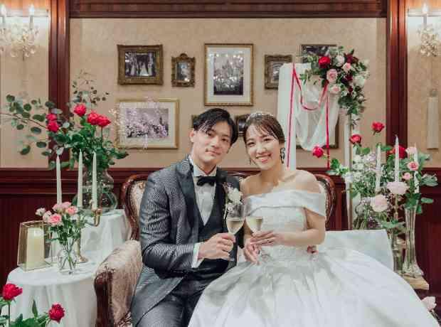 聖堂の静寂から一転、披露宴では大切な友人や家族に囲まれ、心ほどける時間となりました。 高砂へ駆け寄るゲストとの写真撮影。レンズの向こう側で弾けるおふたりの笑顔が、これまで築いてきたゲストとの絆の深さを表していました。 流行に左右されない上質な空間で、飾らない言葉と笑い声が交わされる、幸せに満ちたひとときです。