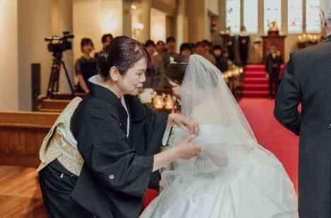 チャペルの扉が開き、挙式が始まります。 新郎様はご両親に背中を押され、ジャケットとブートニアに想いを託されます。 続いて新婦様はお父様と歩み出し、お母様のベールダウンでお仕度を整えていただきバージンロードへ。 家族の愛と絆が一つひとつの所作に込められ、「おめでとう」と「ありがとう」が交わる、心に深く刻まれるセレモニーとなりました。