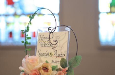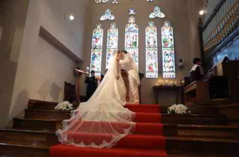 新婦さま、新郎さまともに真っ白なウェディングドレスと真っ白なタキシードでむかえた結婚式。 誓いを交わすときにはお二人から笑顔もあふれる感動的な挙式でした。 ドレスのトレーンも綺麗にみえてゲストからも感動が!