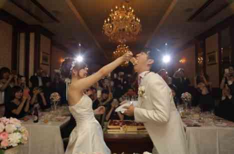 ケーキカットからのファーストバイトは新婦さまからの一口!スプーンからあふれるほどのケーキを新郎さまが食べる際、ゲストからも笑顔が♪ 新郎新婦さま、そしてゲストの皆様に楽しんでいただける披露宴となりました!