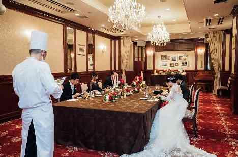 パーティー中にシェフからお料理の説明をしております。当教会自慢のお料理を召し上がりながら、より詳しい説明が直接聞けますよ♪あまりない機会なのでゲストの皆様もとても楽しんでおられました!一生に一度の特別な日に相応しい演出です。