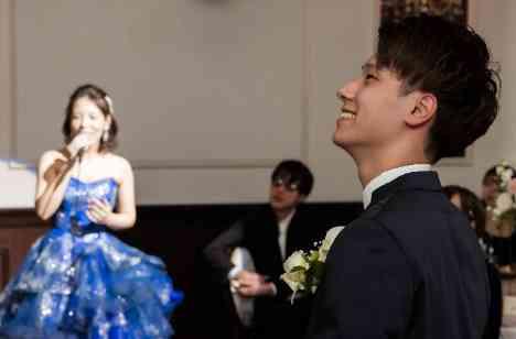 お二人のお席は常にゲストに囲まれ「来てくれて・呼んでくれてありがとう」と感謝のお言葉が溢れていました 新婦様にはもう一人「愛と感謝のお気持ちを伝えたいお相手」が、、、それは一番近くにいるご新郎様 新郎様はとてもビックリされたご様子で新婦様を見つめておられました。近くにいるからこそ普段は伝えられない想い・愛と感謝の気持ちを歌に込め思い出の写真で作った動画とともに届けられました