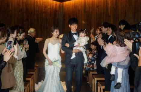 挙式当日は2人だけではなく、1歳になる娘さんとの3人で作り上げた挙式。ゲストの方の温かな拍手に迎えられながら感動の時間になりました。ゲストの方のお顔を1人1人見ることができる距離感だからこそ、大切な方へ込み上げてくる想いもひとしおです。このあとには全員集合で写真撮影も行い、笑顔と感動に包まれた挙式でした