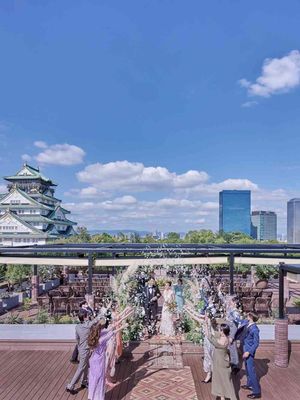 オープンエアのガーデンチャペルでは和装人前式も人気! 大阪城と青空、和装のコントラストが映える空間。 また豊国神社での神前式を執り行うことも可能。大阪城と豊かな緑をバックにより和装の華やかさが引き立つ美空間。和装・ドレスどちらも着たい方にもおすすめ!