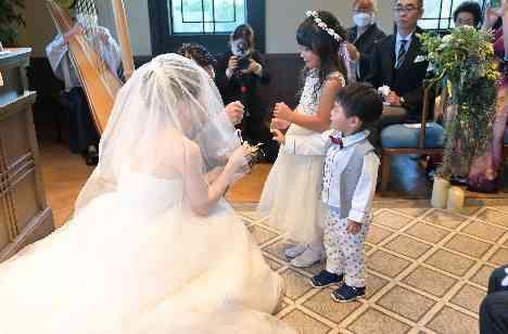 せっかくなら、お子様ゲストにも参加してもらいたい。 リングピローを新郎側のお子様ゲストにご協力をしてもらいました。 照れながらも一生懸命リングピローを運んできてくれる姿にゲストもおふたりもにっこりしながらかわいいとチャペル内が和やかな雰囲気となりました。 このあと、お礼にプレゼントも用意していたので渡してお席に戻って指輪の交換も無事にできました。