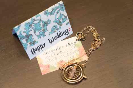 映画の作品が好きなふたりだからこその演出を考えました。 当日の演出だけではなく会場内やペーパーアイテムなど様々なシーンでふたりらしいを取り入れれるようにしました。 会場の装花や席札にこだわりました。ご新郎様のお席にはメッセージカードと一緒に砂時計のペンダントが…。 いったい誰からのプレゼントなのでしょうか。