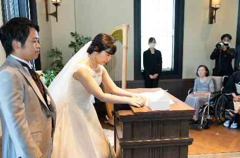 招待したゲストの皆様に見守られる中で誓いました。 結婚証明書は、実はゲストの方に受付と一緒に1ピースずつはめてもらった大切なパズルなのです。 1ピース1ピース想いがのったパズルをこれから幸せになりますとおふたりで完成させていただきました。 ご退場の際は、ゲストの皆様と言葉を交わしたり写真をたくさん撮影したりとチャペルの中も笑顔があふれる瞬間を過ごしました。
