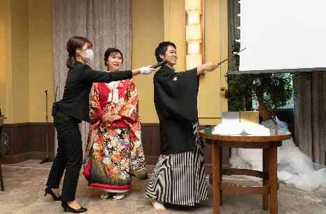 披露宴はたくさん楽しんでいただけるように好きな映画作品のように魔法を使ったりみなさんがあっと驚くような時間になりました。 お色直しは色内掛けに着替え再入場後、ご新郎様が取り出したのは…魔法の杖。呪文を言いながら杖を一振りするとテーブルの蝋燭が一瞬で火が付き会場内は驚きと笑いの大盛り上がりしました!