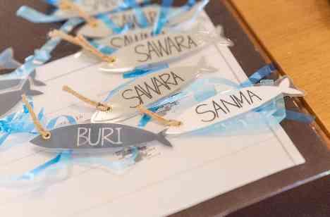 各テーブルに置いたお魚のモチーフは、エスコートカードの役割もありました。 ゲストの皆様には受付で小さなお魚のカードをお配りし会場までお持ちいただきました。 各テーブルには、ゲストの皆様にお配りしたお魚カードと一緒のお魚が書くテーブルに置かれています。 エスコートカードをお手紙を添えてお作りする方もいらっしゃいますがおふたりらしさを出しやすいアイテムの一つです。