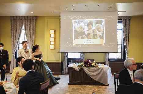 「これまで残してきた皆との写真は今でも私たちの宝物」 と、とても写真を大事にしてきたお二人。 結婚式の思い出も、たくさん残したい・・・! そんなお二人の思いを叶えるため ゲストが撮った写真をその場でスクリーンに映し出し 共有できる【フォトシュシュ】を使った演出を取り入れていただきました♪