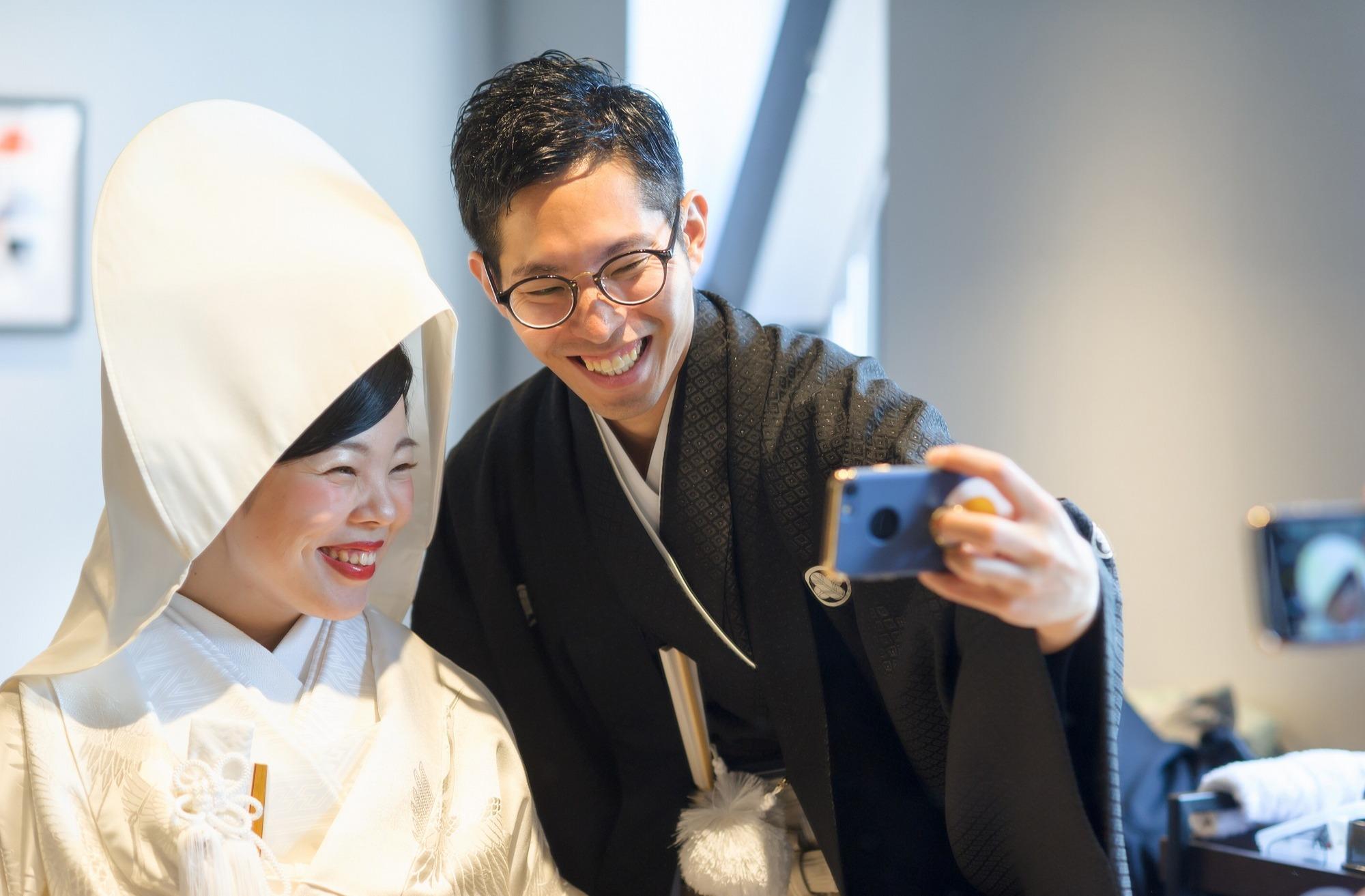晴れ渡る青空の下、堂々とそびえる大阪城をバックに執り行われた人前式。紋付袴と白無垢の出で立ちはお城の景色にマッチ。ふたり自身の言葉での誓いも、時おり笑い声が起こるなど和やかだった。「挙式後はそのまま屋上でブーケトスとウェルカムパーティ。ゲストと記念撮影やおしゃべりもできて、良い時間になりました」