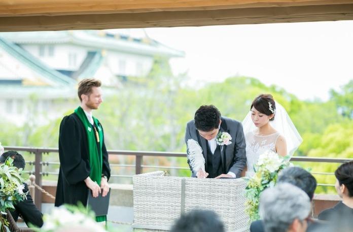 大阪城をバックに笑顔あふれる挙式
