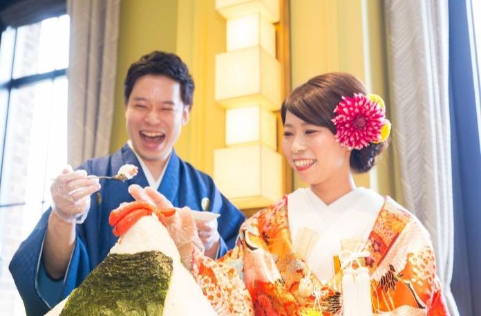 ケーキは定番なのでみんなのやらないことにしようと決めていて、妻の実家でお米を作っているのもあり、おにぎりになりました。披露宴は和装だったため和の雰囲気に合うし毎朝ごはんを食べさせてもらう、という意味的にもぴったりです。おにぎりは高さ35〜40cmあり、約10キロとけっこうな重さでした。妻におにぎりをプレートごと持ち上げて食べさせてもらうのですが、僕がその作業を補助することでふたりの共同作業を!